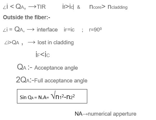 - If a light is launched at an angle greater than acceptance angle then it will be lost in cladding because the angle of incidence at care cladding inter face will be less than critical angle. with the fiber:-