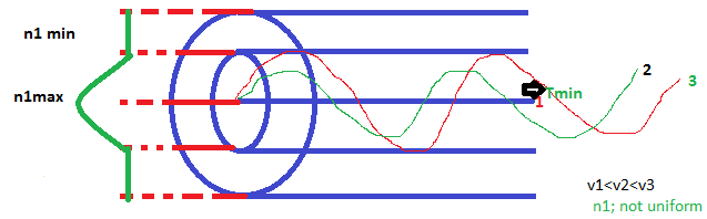 - The refractive index profile is non- uniform i.e maximum at core axis and reduce towards the radical distance to the cladding. Hence, the mode travelling near the core axis will be slow as compared the mode travelling near the cladding. Hence, the transit time of fastest mode i.e mode near the core the core will increase and the transit time of slowest mode i.e mode travelling Zig-Zag with will decrease , Hence, ∂T=Tmax-Tmin will reduced and this is known as Transit time equalization. Hence, the inter modal dispersion will reduce.