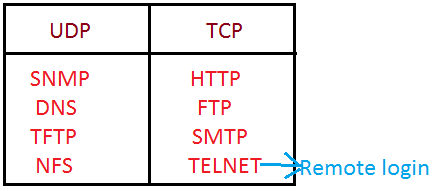 NOTE 2:- Simple network management protocol(SNMP), domain name server(DNS), trivial file transfer protocol(TFTP), network file system(NFS) uses the service of UDP.